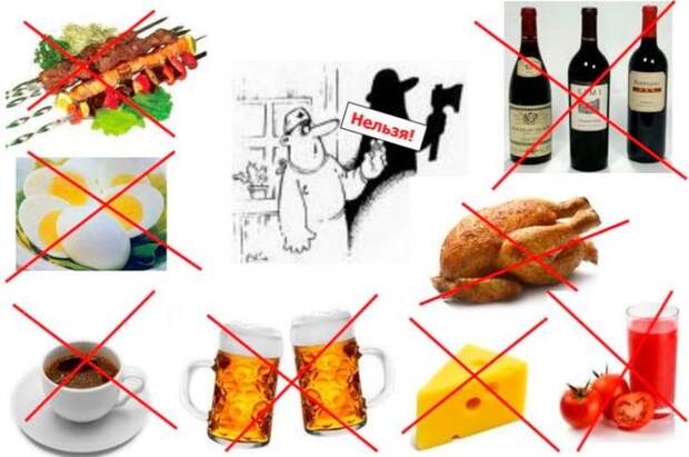 *Категорически нужно исключить из рациона копченые и жирные продукты. Требуется сократить потребление грибов и специй, снизить до минимума употребление алкоголя.