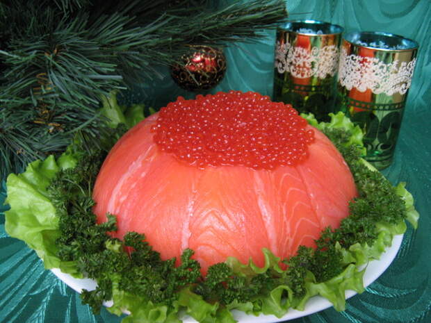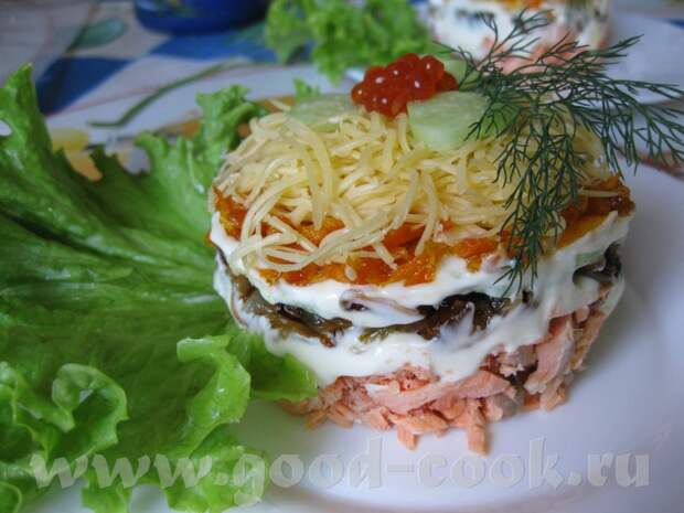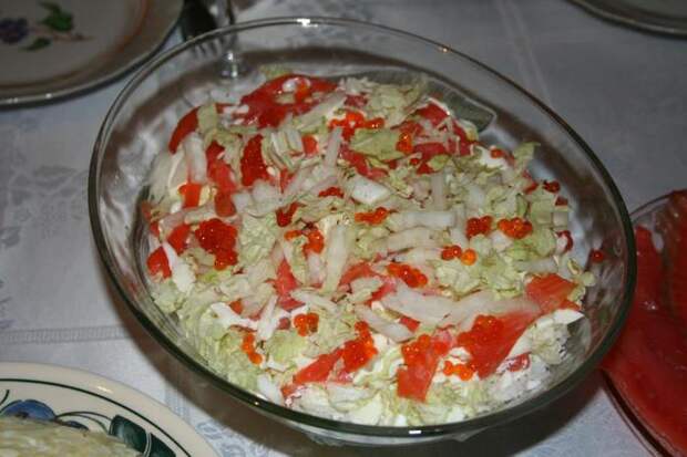 Ну и, наконец, украшаем салат красной икрой (можно просто выложить слой сверху)