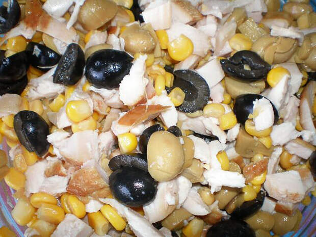 Потом перемешивается все в одной ёмкости с кукурузой, ни в коем случае не солить, салат итак будет соленый.