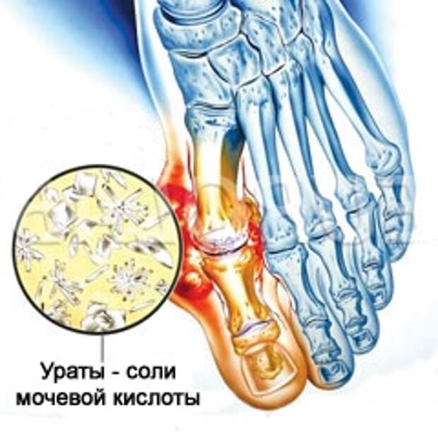При отложении так называемых уратных солей в наших суставах развивается подагра.