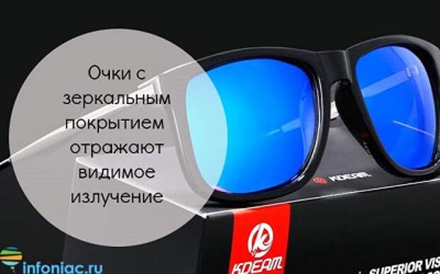 Дополнительные покрытия солнцезащитных очков представляют собой своеобразные фильтра, которые обеспечивают комфортное ношение очков. Так, для отражения бликов используются поляризационные фильтры и противобликовое покрытие. Но наиболее распространенным является зеркальное покрытие, отражающее видимое излучение.