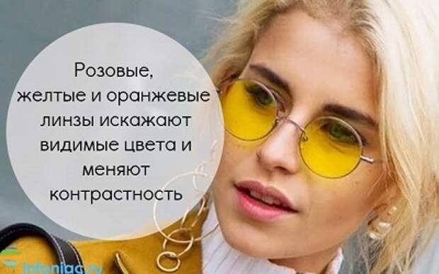 Розовые, желтые и оранжевые линзы имеют право на жизнь в качестве солнцезащитных очков, однако они искажают естественные цвета, изменяют контрастность. Наиболее приемлемый цвет линз очков с точки зрения защиты глаз от ультрафиолета – это серый или серый с зеленым оттенком.