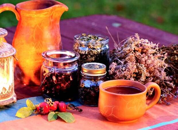 Травяной отвар из трав: зверобой продырявленный, хвощ полевой, трава душицы, лист брусники, лист земляники, корень аира.