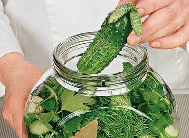 Отобранные огурцы промойте холодной водой и высушите полотенцем. Затем уложите в емкость, лучше вертикально, перекладывая огурцы слоями трав и специй.